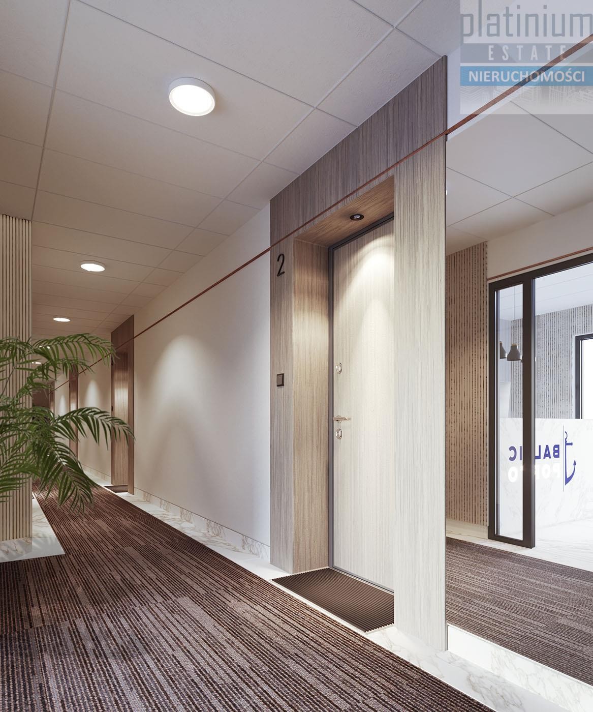 Projektując części wspólne, wybrano minimalistyczne formy i prostą zabudowę, doskonale komponujące się z akcentami drewna, ciepłymi beżami oraz delikatnymi szarościami.