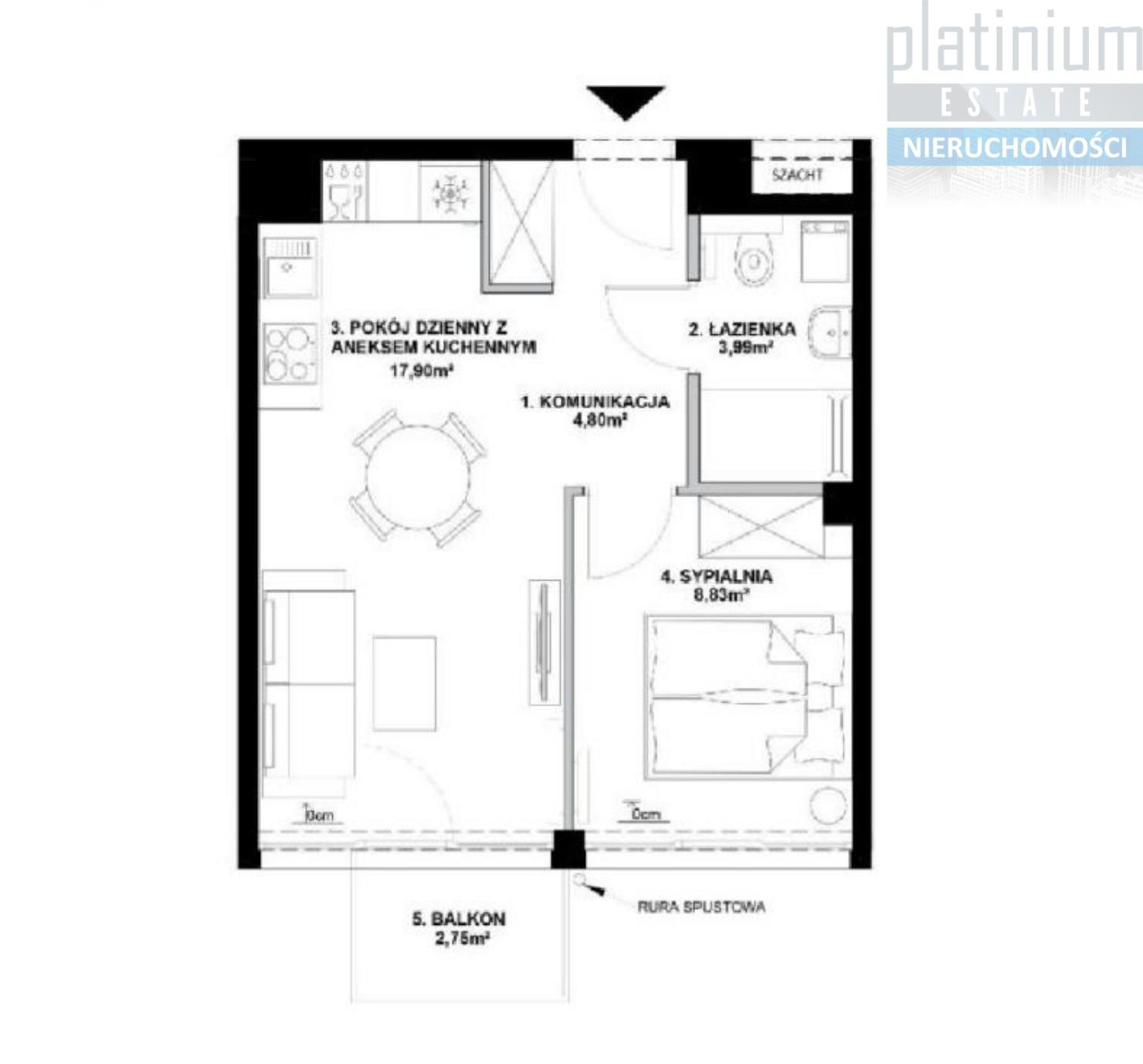 Dwupokojowy apartament na pierwszym piętrze o powierzchni 35,31m2 składa się z pokoju dziennego z aneksem kuchennym (17,81m2), komunikacji (4,71m2), łazienki (4,01m2), sypialni (8,78m2) oraz balkonu (2,49m2)